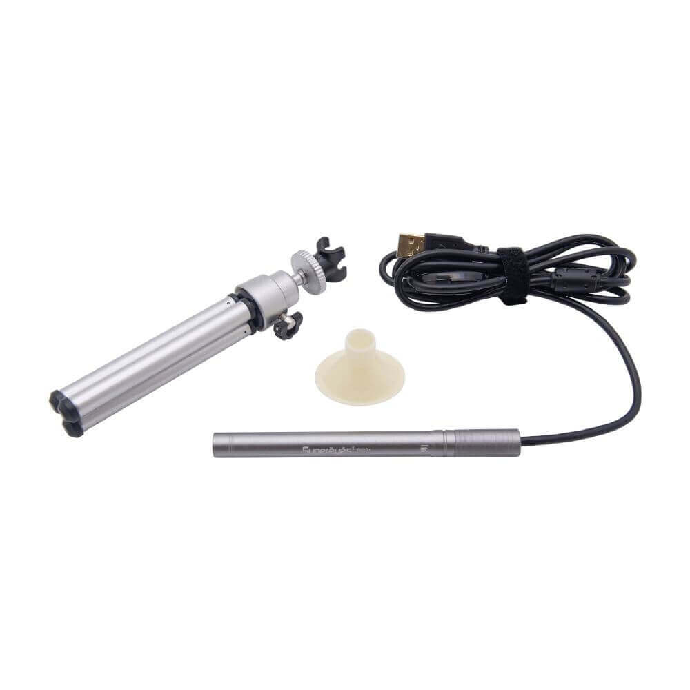 Supereyes B003+ (2 MP) — портативный микроскоп, напоминающий по форме шариковую ручку. Предусмотрены регулятор кратности и светодиодная подсветка. Управляется с помощью кнопки на USB- кабеле. Высокая скорость захвата дает возможность без зависания и задержек выводить процесс исследования на монитор компьютера. Максимальное увеличение составляет 300х. Рабочее расстояние до исследуемого объекта можно регулировать с помощью ножек штатива. В комплектацию входит фокусирующая насадка, телескопическая тренога, пинцет, рефлектор. Прибор совместим с Windows 7/8/XP (SP2, SP3)/Vista/Mac OS/Linux.